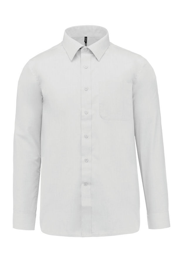 Chemise homme. Col avec pointe de col baleinée. Boutons ton sur ton. Poche poitrine côté gauche à angles arrondis. Empiècement dos double. Poignet réglable à angles arrondis avec patte de manche capucin boutonnée. 2 boutons de rappel. Bas arrondi. Finition coutures rabattues.