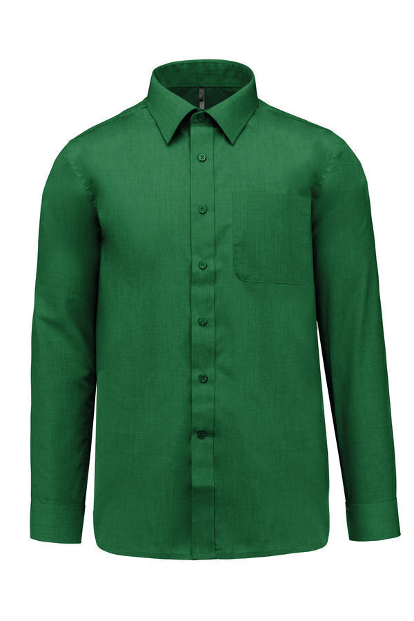 Chemise homme. Col avec pointe de col baleinée. Boutons ton sur ton. Poche poitrine côté gauche à angles arrondis. Empiècement dos double. Poignet réglable à angles arrondis avec patte de manche capucin boutonnée. 2 boutons de rappel. Bas arrondi. Finition coutures rabattues.
