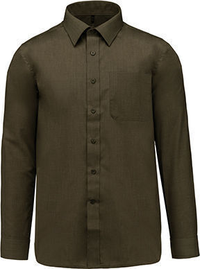 Chemise homme. Col avec pointe de col baleinée. Boutons ton sur ton. Poche poitrine côté gauche à angles arrondis. Empiècement dos double. Poignet réglable à angles arrondis avec patte de manche capucin boutonnée. 2 boutons de rappel. Bas arrondi. Finition coutures rabattues.