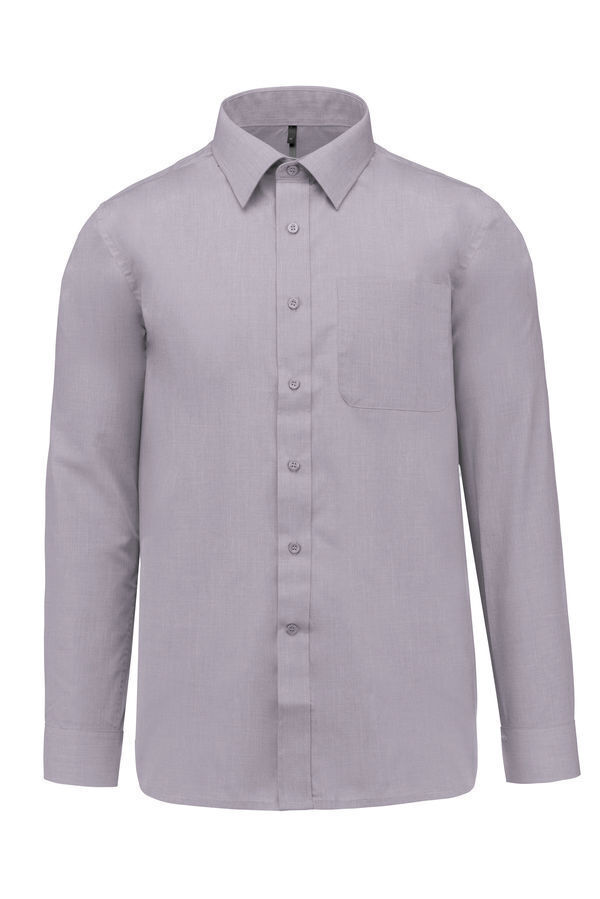Chemise homme. Col avec pointe de col baleinée. Boutons ton sur ton. Poche poitrine côté gauche à angles arrondis. Empiècement dos double. Poignet réglable à angles arrondis avec patte de manche capucin boutonnée. 2 boutons de rappel. Bas arrondi. Finition coutures rabattues.