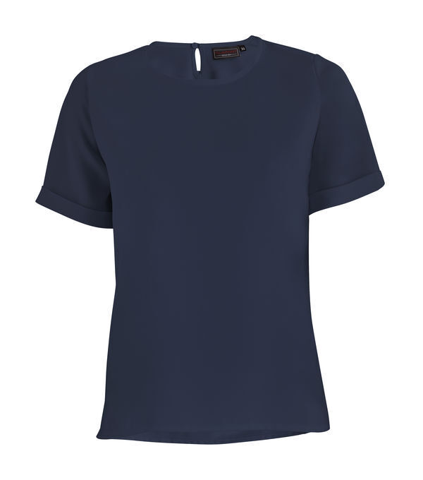 Top fluide entièrement doublé. Encolure ronde. Décolleté dos avec goutte. Manches courtes avec petit revers.