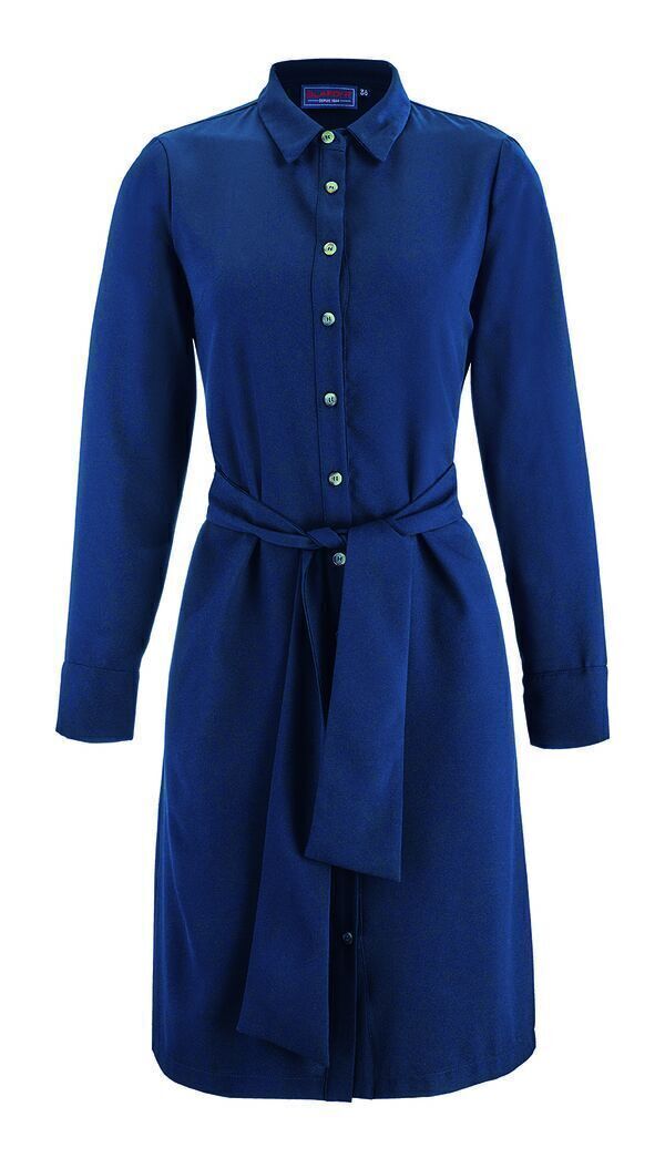 Robe chemise ceinturée. Fermeture milieu devant par patte de boutonnage avec 11 boutons effet corne. Pinces poitrine. Découpe dos avec plis milieu dos. 2 passants dans coutures côté. Bas de manche avec poignet rapporté, fermé par 1 bouton. Ceinture en tissu de 9,5 cm de largeur.