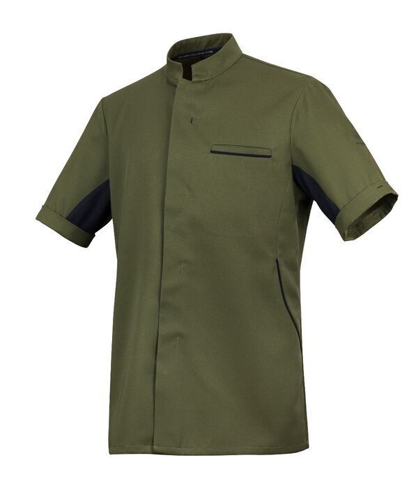 Veste homme à col officier, biais de propreté Seaqual® à l’encolure. Fermeture milieu devant par boutons-pression cachés. Poche poitrine côté gauche. Découpes côtés avec un liseré de couleur. Manches longues finies par poignets et broderie. Empiècement maille sous les bras.
