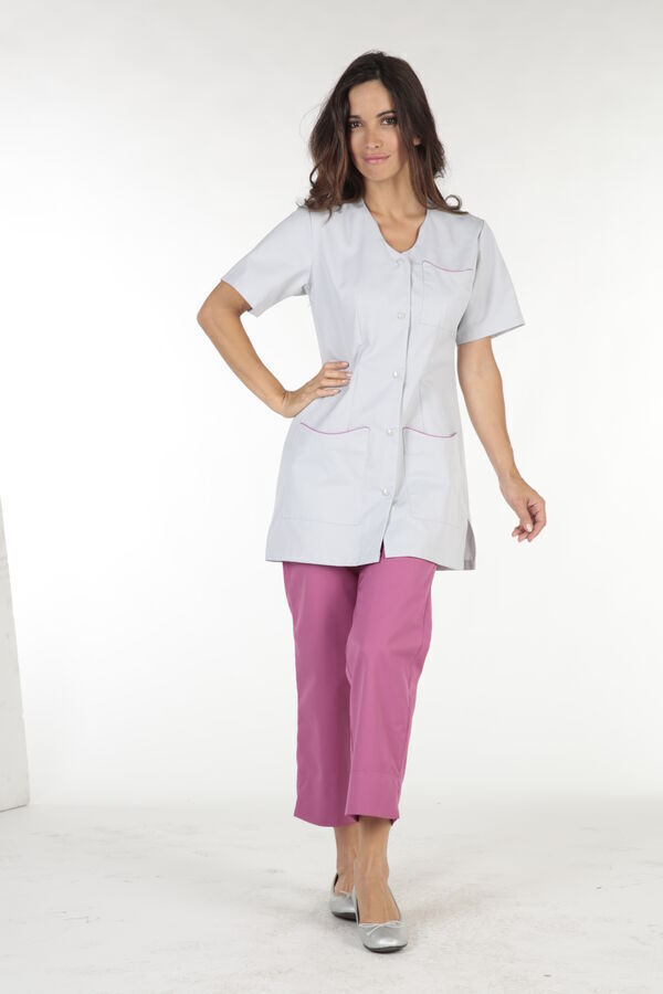 Tunique femme. Encolure fantaisie ton sur ton. Fermeture milieu devant par 5 pressions ton sur ton. 2 poches basses plaquées avec passepoil contrasté. Manches courtes. Coupe cintrée. Longueur : 80 cm.