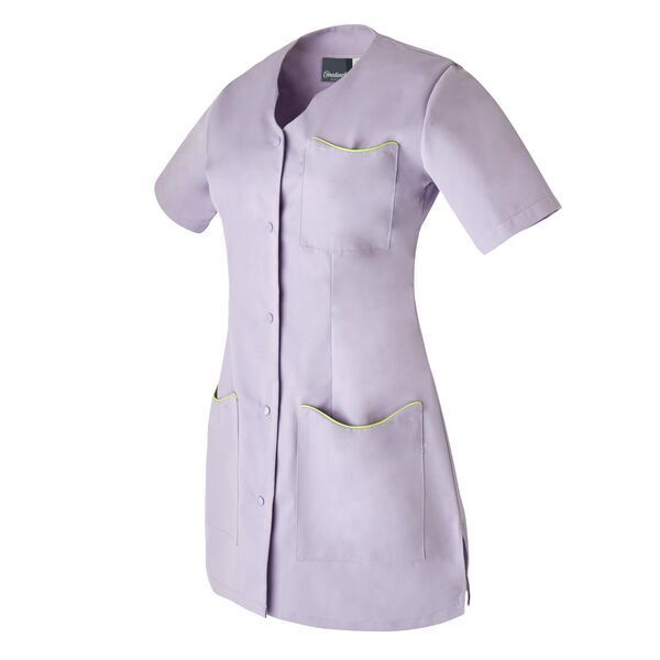 Tunique femme. Encolure fantaisie ton sur ton. Fermeture milieu devant par 5 pressions ton sur ton. 2 poches basses plaquées avec passepoil contrasté. Sans manches. Coupe cintrée. Longueur : 80 cm.