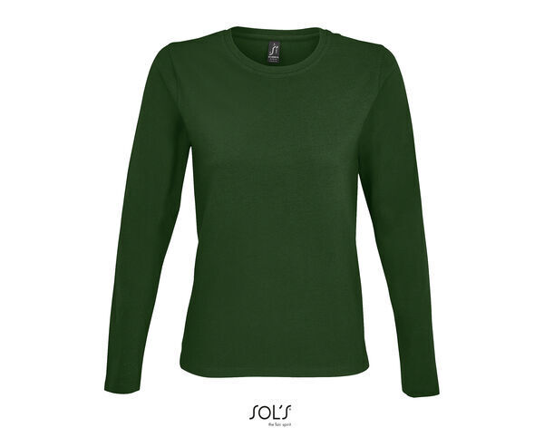 T-shirt femme. Col rond bord-côte avec élasthanne. Bande de propreté au col. Manches longues.