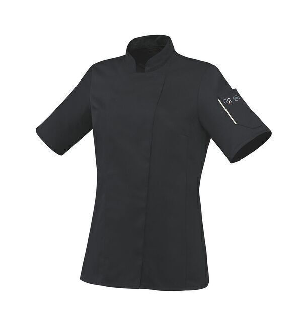 Veste femme thermorégulante 37,5®. Col mao. Fermeture asymétrique par pressions cachées. Pinces poitrine. Manches courtes. Poche stylo sur manche gauche au porter avec broderie.