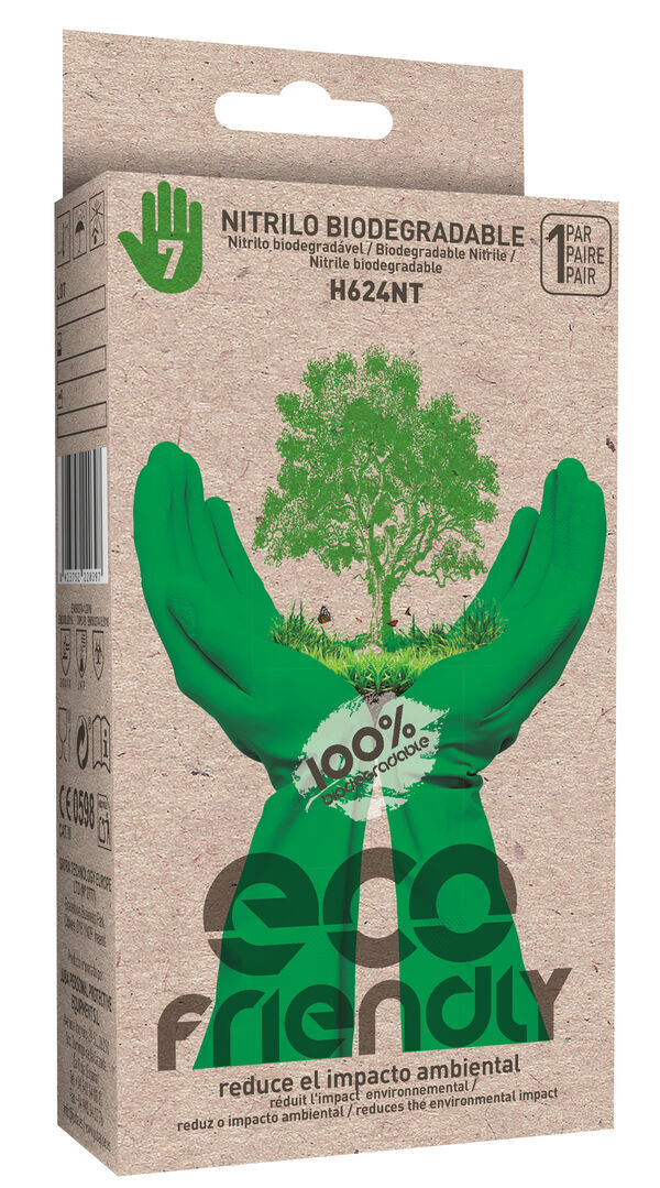 Gants nitrile non supportés biodégradables. Chloré pour une plus grande résistance chimique. Finition paume antidérapante. Épaisseur : 0,20 mm. Longueur : 33 cm.