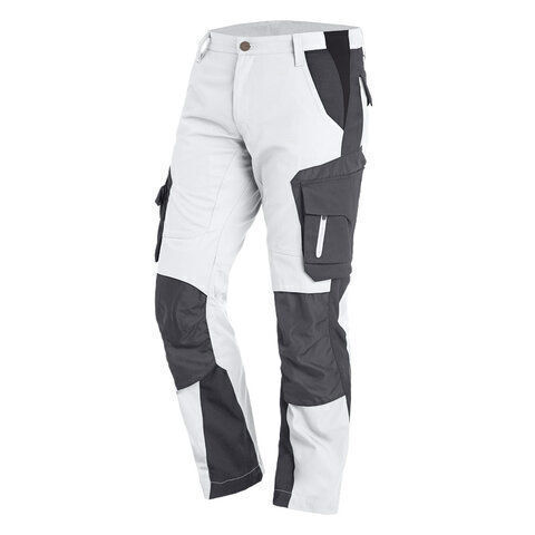 Pantalon homme ergonomique à poches genouillères. Taille avec insert élastique aux côtés. Multiples poches volumineuses de chaque côté, poche téléphone et poche mètre. Poches genoux préformées renforcées Cordura®. |Détails rétroréfléchissants sur les mollets. E.J. : 84 cm. 3 longueurs disponibles.