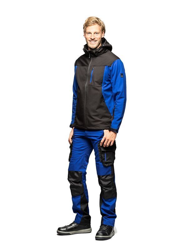 Veste softshell bicolore homme. Capuche ajustable, amovible. Fermeture milieu devant zippée avec protège menton. 2 poches basses zippées dans la découpe. Poche poitrine zippée. Manches longues avec poignets ajustables par pattes auto-agrippantes. 1 poche intérieure ouverte et 1 autre zippée. Détails rétroréfléchissants sur les avant-bras. Coupe ajustée. Imperméabilité et respirabilité 10K/5K