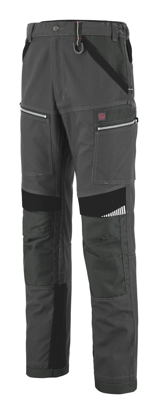 Pantalon à poches genouillères. Ceinture élastiquée côtés, 6 passants doubles. 2 poches italiennes dont 1 avec poche monnaie, 1 poche cuisse à soufflet avec rabat à grippers, 1 poche mètre en biais avec surpoche, 1 poche cuisse à rabat avec poche mètre intégrée et surpoche téléphone. 2 poches genouillères en tissu renforcé réglables en 2 niveaux de hauteur avec ouverture par le haut. Sangle porte-outils. Renforts arrières bas de jambes. E.J. : 82 cm + ourlet de 5 cm