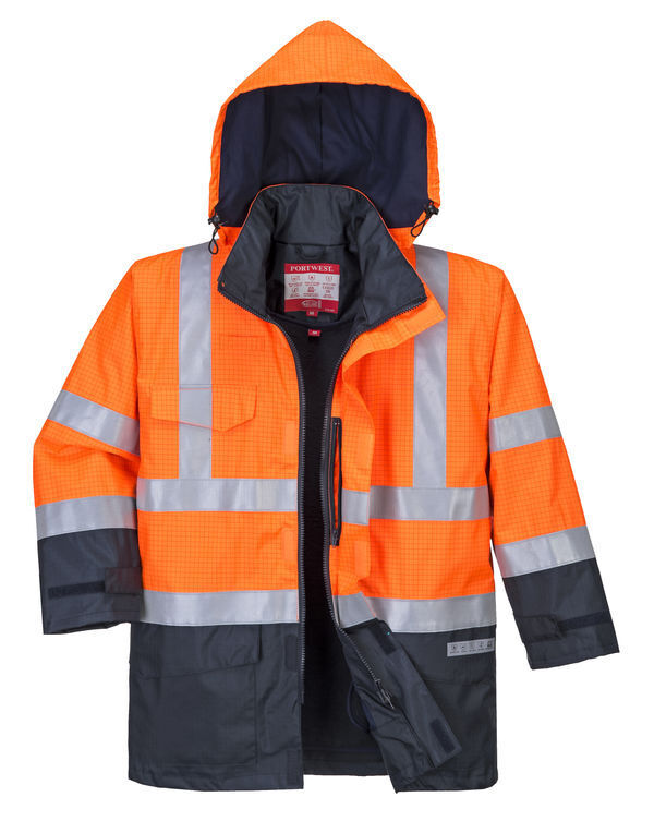 Parka Bizflame Rain Hi-Vis multirisques. Capuche amovible. Bande à cousue réfléchissante résistante à la flamme de qualité supérieure. Entièrement doublée et matelassée. 4 poches. Poche téléphone.