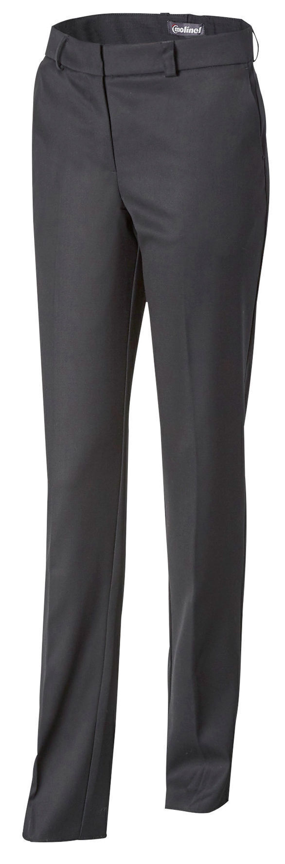 Pantalon femme à ceinture 6 passants. Fermé par un bouton caché et une agrafe, braguette zippée. 2 poches italiennes, 1 poche passepoilée dos avec ruban gros grain. Pinces dos. Finition bas surfilé. E.J. : 85 cm