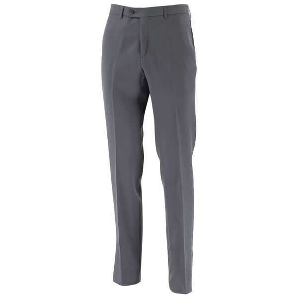 Pantalon costume homme. Ceinture 5 passants fermée par 1 bouton et 1 crochet. Braguette à glissière. Poches italiennes. 2 poches dos fermées par bouton. Coupe droite. Bas de jambe non fini. E.J. : 90 cm.
