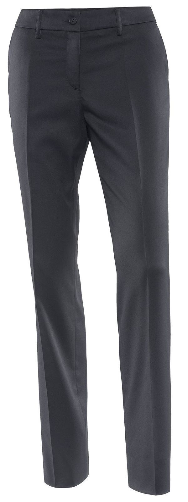 Pantalon femme. Ceinture 5 passants fermée par 1 bouton et 1 bouton intérieur. Braguette à glissière. Poches italiennes. Plis devant et dos marqués. Pinces dos. Bas de jambe non fini. E.J. : 90 cm.