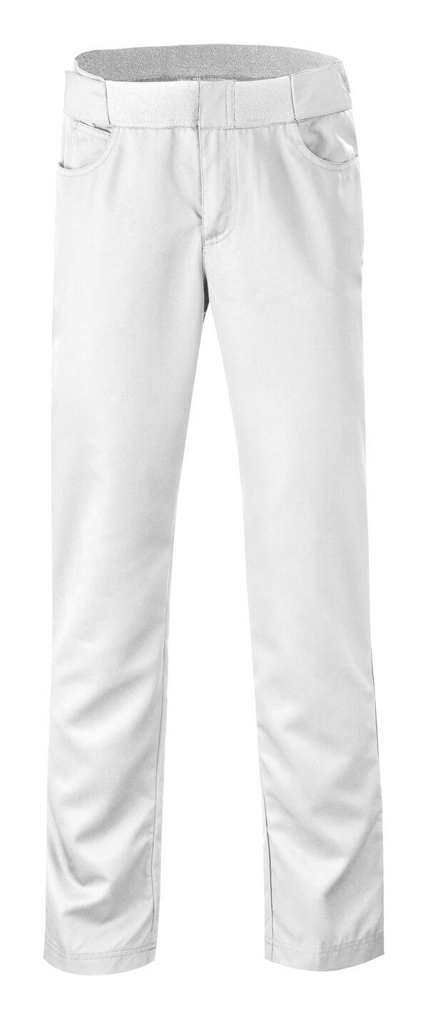 Pantalon mixte 5 poches. Ceinture avec élastique transfert d’humidité. Taille ajustable avec 2 pattes à élastique auto-agrippant à la ceinture. 2 poches cavalières avant avec poche ticket. 2 poches plaquées dos. Bas de jambe réglable sur 3 positions par système de pressions. E.J. : 82 cm.