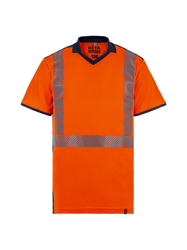 T-shirt haute visibilité thermorégulant. Col V en bord côte. Manches courtes avec bandes contrastées. Maille ajourée sous les bras pour une ventilation maximale. Empiècements contrastés sur les épaules et au bas du t-shirt. | 2 bretelles et 1 ceinture rétroréfléchissantes microbilles segmentées RETHIOTEX®. Maille thermorégulante 37,5® double face. Coupe ajustée.