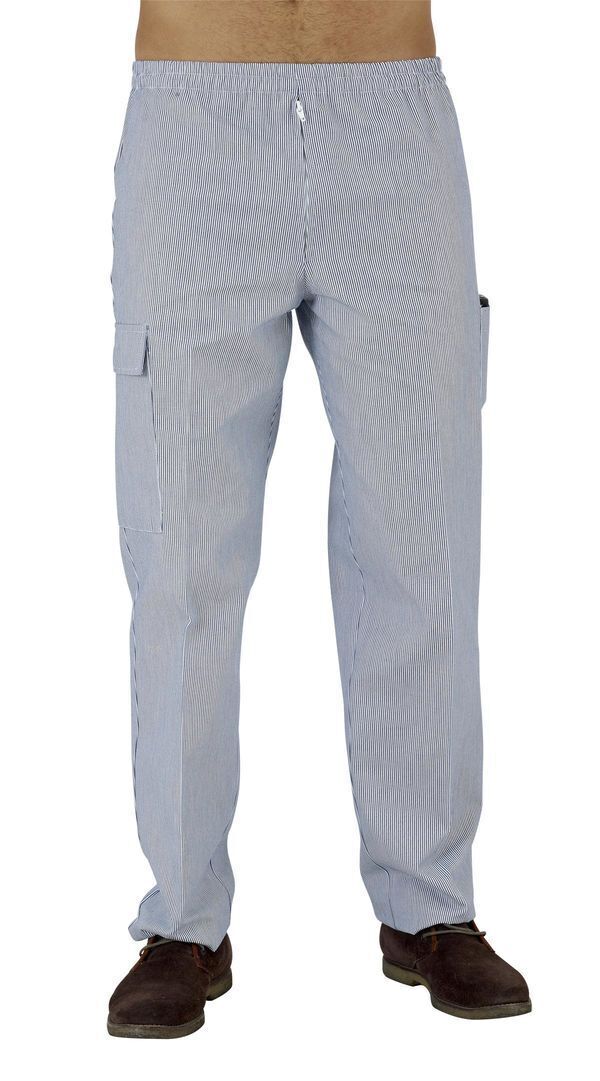 Pantalon homme. Ceinture élastiquée, braguette zip. 1 poche BIP cuisse gauche, 1 poche à soufflet avec rabat cuisse droite. E.J. : 82 cm.