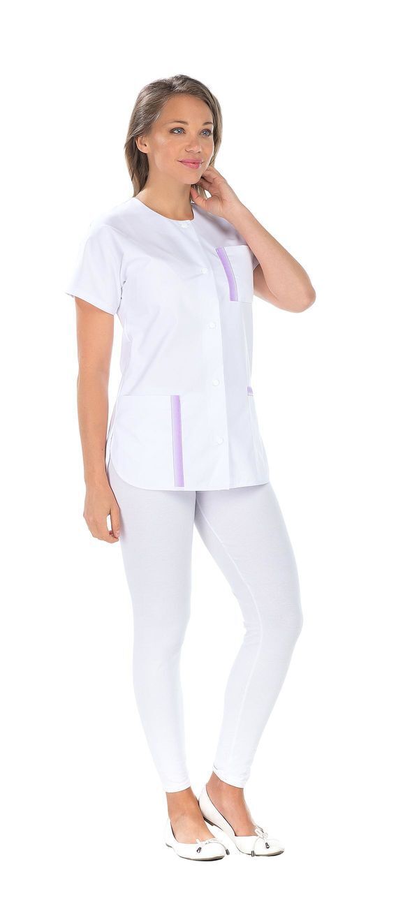 Tunique femme. Fermeture milieu devant par boutons-pression. 2 poches basses. Poche poitrine avec ruban décoratif. Manches courtes kimono. Bas forme liquette. Fentes côtés. Longueur : 75 cm.