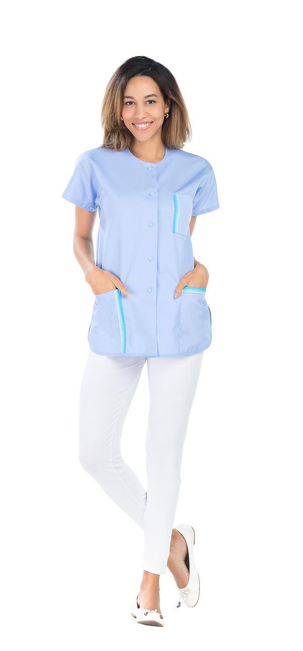 Tunique femme. Fermeture milieu devant par boutons-pression. 2 poches basses. Poche poitrine avec ruban décoratif. Manches courtes kimono. Bas forme liquette. Fentes côtés. Longueur : 75 cm.