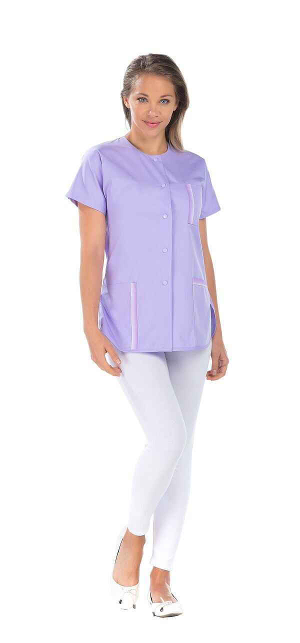 Tunique femme. Fermeture milieu devant par boutons-pression. 2 poches basses. Poche poitrine avec ruban décoratif. Manches courtes kimono. Bas forme liquette. Fentes côtés. Longueur : 75 cm.