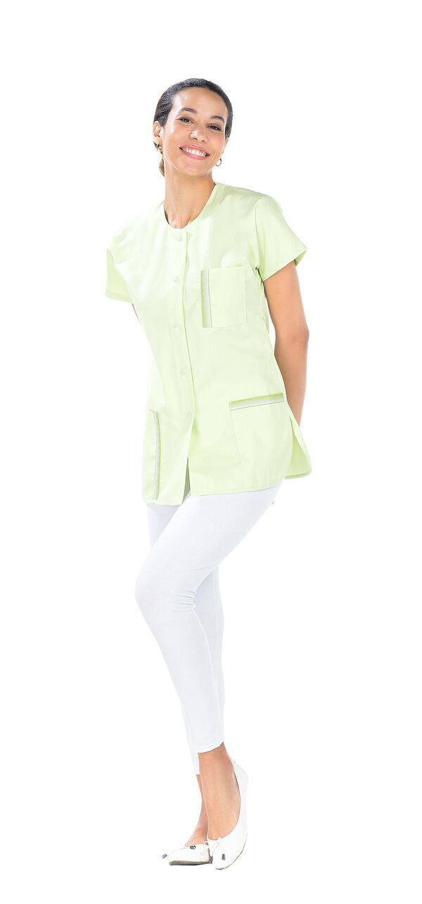 Tunique femme. Fermeture milieu devant par boutons-pression. 2 poches basses. Poche poitrine avec ruban décoratif. Manches courtes kimono. Bas forme liquette. Fentes côtés. Longueur : 75 cm.