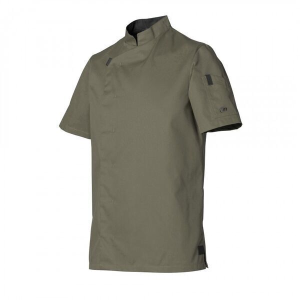 Veste de cuisine homme à col officier. Fermeture asymétrique avec patte en gros grain, 7 boutons-pression cachés. Oeillets d'aération. Fentes côtés. Pinces dos. Manches courtes avec poche côté gauche dont un compartiment stylo.