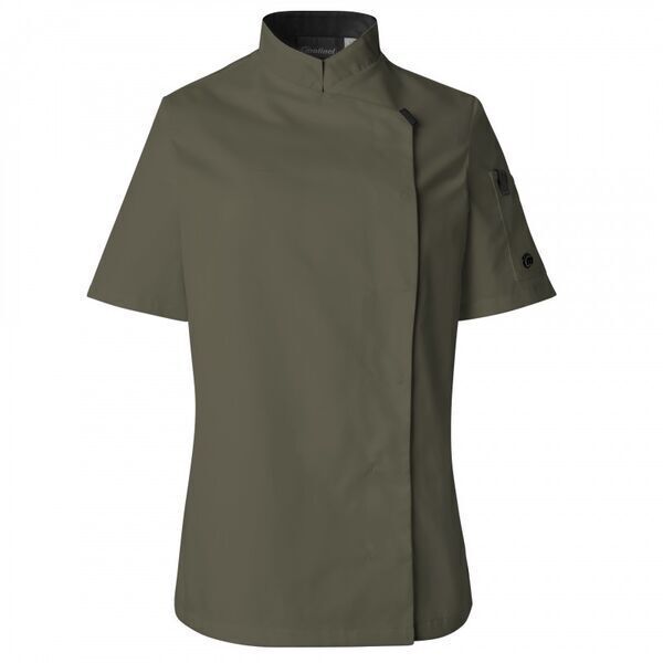 Veste de cuisine femme à col officier. Fermeture asymétrique avec patte en gros grains, 7 boutons-pression cachés. Oeillets d'aération. Fentes côtés. Pince dos. Manches courtes avec poche côté gauche dont un compartiment stylo.