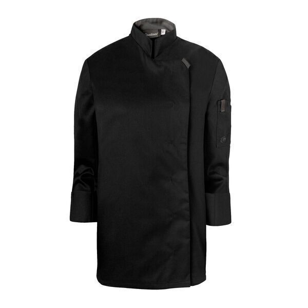 Veste de cuisine femme à col officier. Fermeture asymétrique avec patte en gros grain, 7 boutons-pression cachés. Œillets d'aération. Fentes côtés. Pinces dos. Manches longues avec poche côté gauche dont un compartiment stylo.
