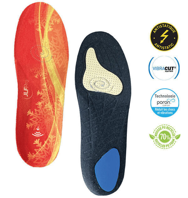 Semelles mixte antistatiques avec face polaire au contact du pied à base de mousse PU recyclée, de PORON® et d'EVA. Traitées S3F® et amortissantes avec soutien de la voûte plantaire pour plus de confort. Protection des articulations des membres inférieurs et de la colonne vertébrale grâce à l'insert talon en PORON®.