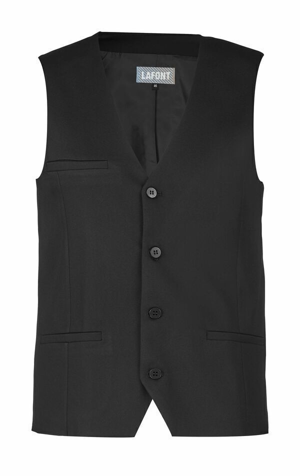 Gilet homme. Fermeture milieu devant par boutons. Poche poitrine insérée côté droit. 2 poches basses passepoilées.