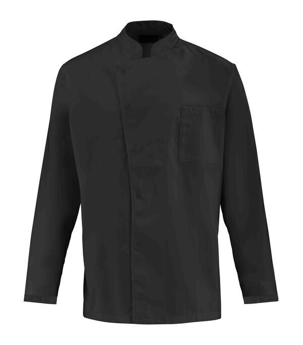 Veste de cuisine à col officier. Fermeture asymétrique fermée par grippers cachés. Poche poitrine avec compartiment stylo. Œillets d'aération sous les bras. Manches longues avec pattes de relevage.