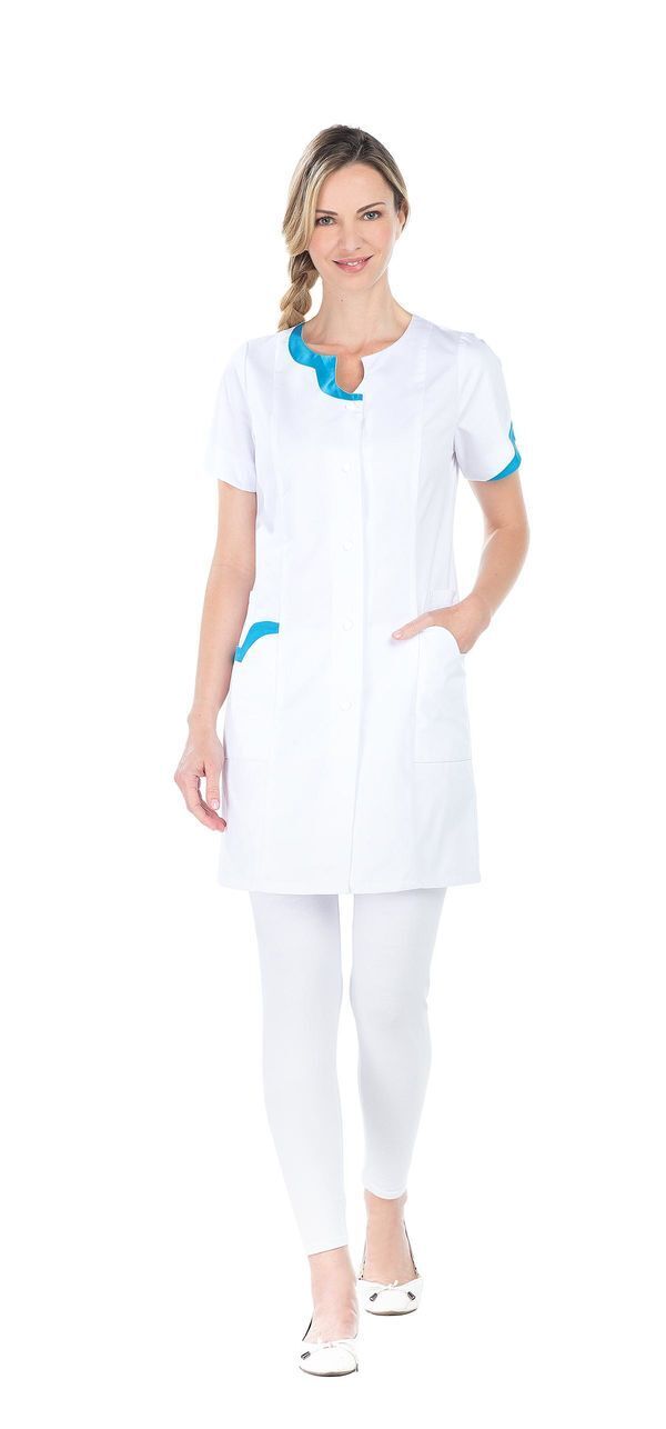 Tunique femme ajustée. Fermeture milieu devant par pressions. 2 poches basses. 2 poches BIP. Manches courtes. 2 fentes dos. Coupe ajustée. Longueur : 85 cm.