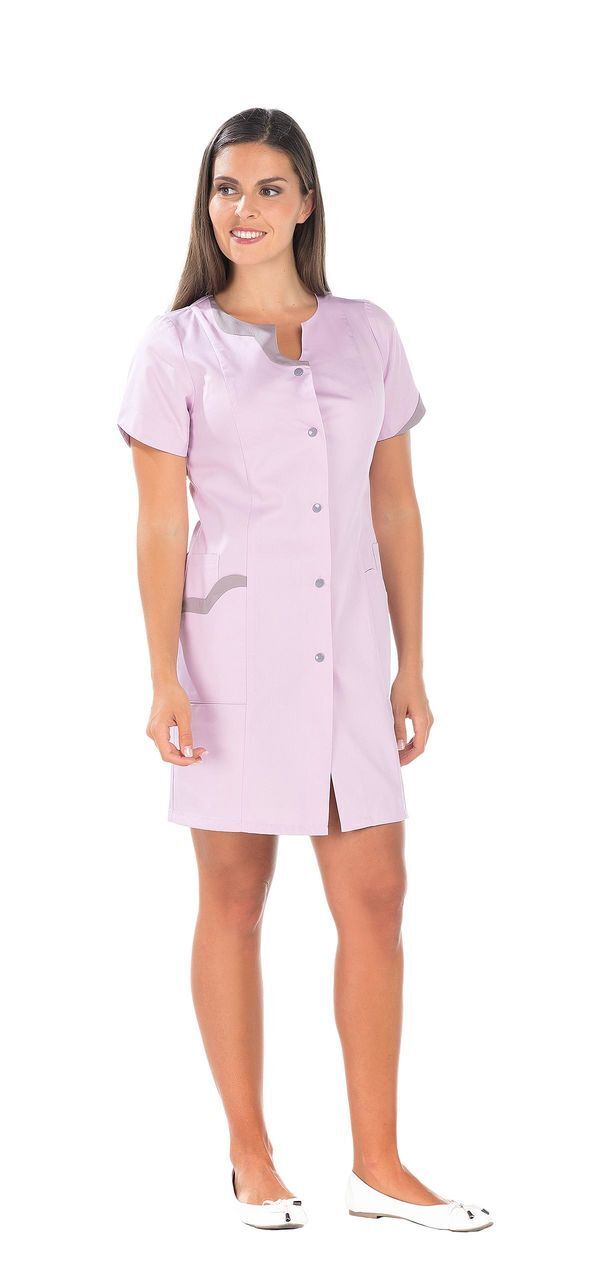 Tunique femme ajustée. Fermeture milieu devant par pressions. 2 poches basses. 2 poches BIP. Manches courtes. 2 fentes dos. Coupe ajustée. Longueur : 85 cm.