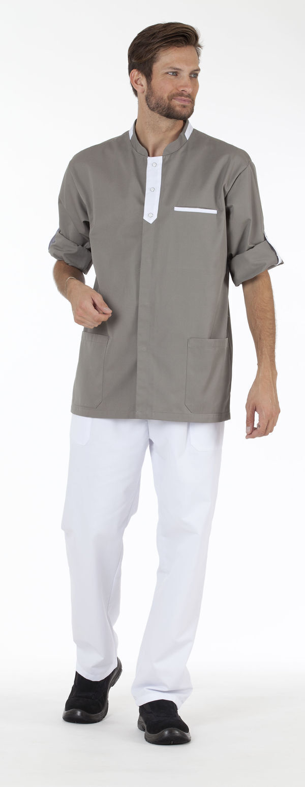 Tunique homme. Col officier fantaisie avec patte contrastée. Fermeture centrale par 6 pressions, dont 3 imitations boutons sur patte. Poche poitrine avec passepoil contrasté, 2 poches basses plaquées. Manches transformables avec pattes contrastées. Longueur : 80 cm.