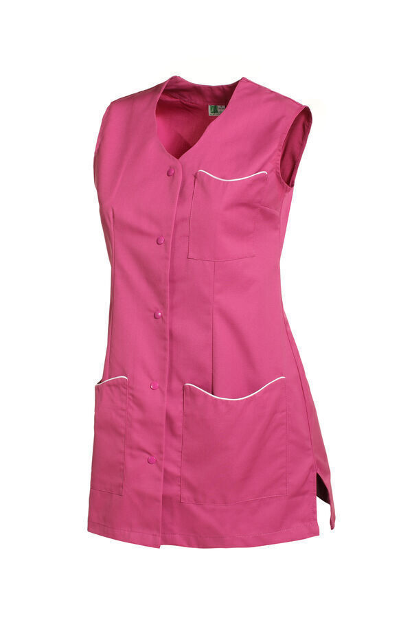 Tunique femme. Encolure fantaisie ton sur ton. Fermeture milieu devant par 5 pressions ton sur ton. 2 poches basses plaquées avec passepoil contrasté. Sans manches. Coupe cintrée. Longueur : 80 cm.