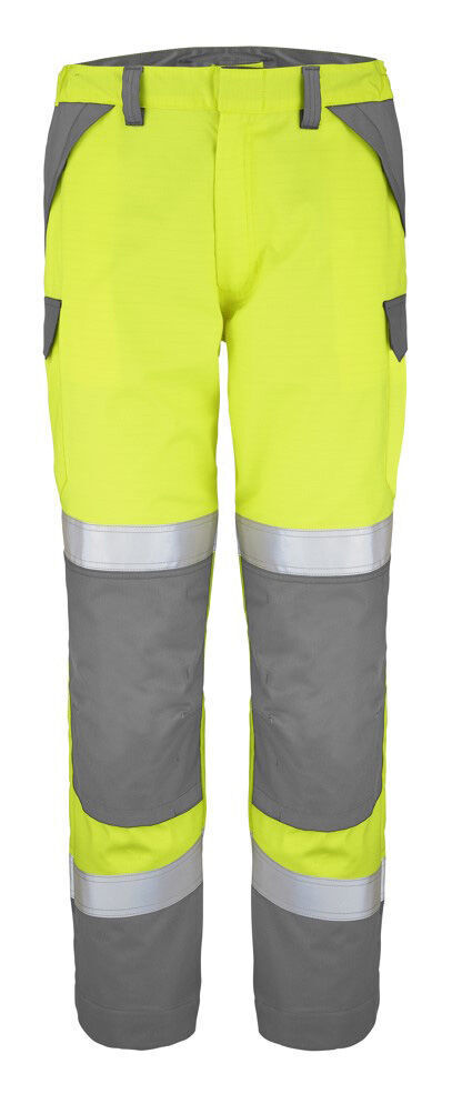 Pantalon poches genoux ATEX HV bicolore haute visibilité. Ceinture élastiquée côtés avec réhausse dos, 5 passants. Fermeture centrale par bouton caché et braguette zippée. 2 poches italiennes à rabat fermé par boutons-pression cachés. 2 poches à rabat plaquées et soufflet à l'arrière fermé par boutons-pression cachés. Poches genoux. 1 poche à rabat dos fermé par boutons-pression cachés. Finition bas de jambes par ourlets. | Bandes rétroréfléchissantes de 50 mm. E.J. : 80 cm (+5 cm).