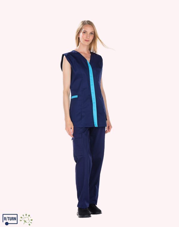 Tunique encolure V. Fermeture milieu devant par boutons-pression, parement contrasté. Découpe de cintrage. Poche poitrine, poche BIP. 2 poches basses semi-volantes. 2 fentes dos. Longueur : 75 cm.