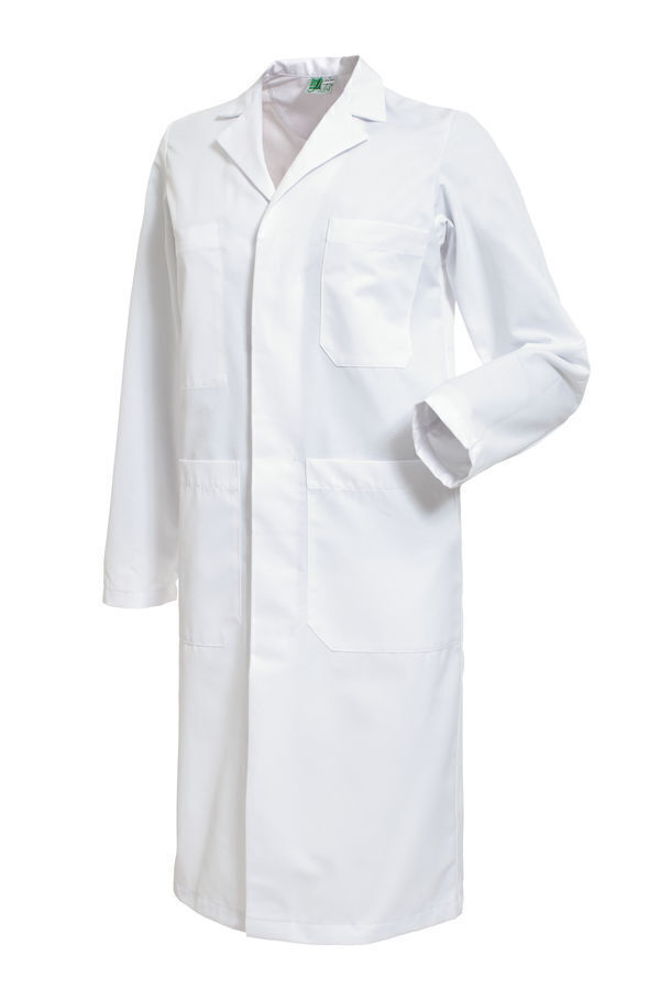 Blouse homme. Col tailleur. Fermeture milieu devant par boutons-pression sous patte. Poche poitrine. 2 poches basses. Manches longues. Longueur : 100 cm.
