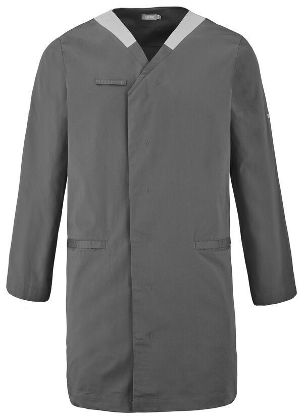 Blouse . Encolure V contrastée, collerette de marquage intérieur. Fermeture croisée par grippers cachés. 2 poches basses passepoilées. Passant porte-badge. Manches transformables. Longueur : 100 cm.
