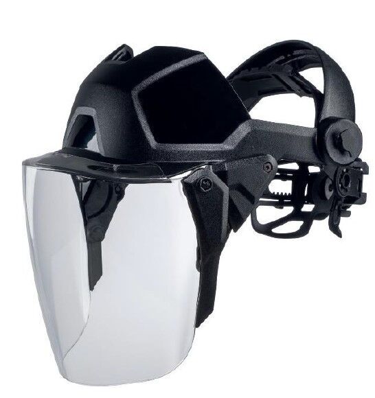Protection faciale multisystème prémontée avec visière en polycarbonate incolore. Large repose-nuque avec réglage en hauteur et largeur. Dispositif de verrouillage en continu. Position de repos centrée au-dessus la tête. Mécanisme de relevage avec réglage en continu. Fermeture à rotation pour un réglage individuel. Recouvrement frontal intégré.