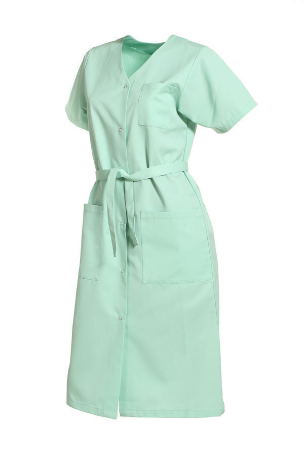 Blouse femme encolure V. Fermeture milieu devant par 6grippers. Ceinture amovible. Poche poitrine et 2 poches basses plaquées. Manches courtes avec pattes pressionnées. Longueur : 110 cm.