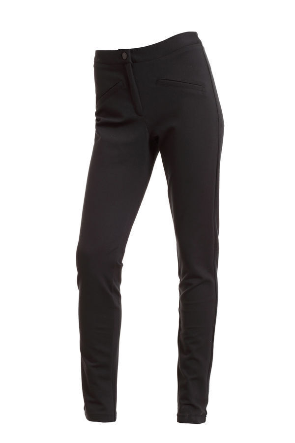 Pantalon femme en maille. Ceinture plate fermée par 1 bouton. Braguette zippée. 2 fausses poches passepoilées. Coupe slim. E.J. : 80 cm.