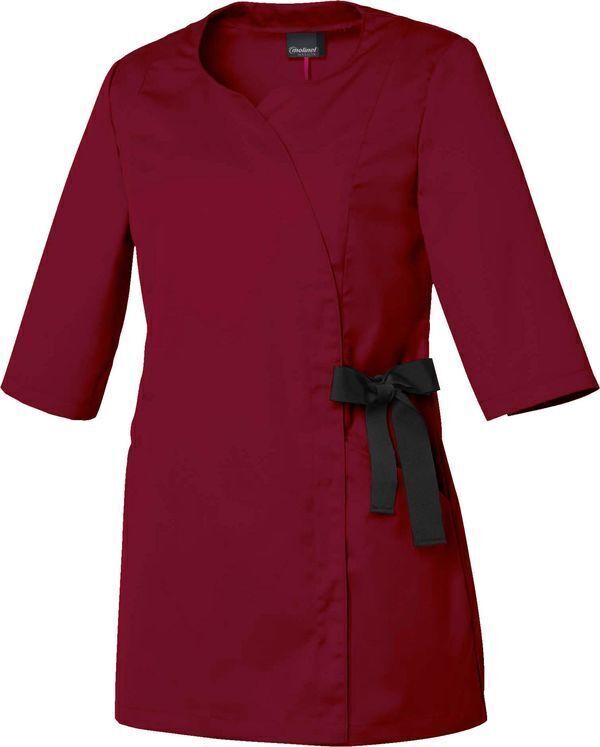 Tunique à encolure fantaisie. Fermeture asymétrique par grippers cachés et nœud fantaisie sur le côté gauche. Découpes bretelles devant et pinces dos. Poches basses dans découpes devant. Poche stylo côté droit. Manches 3/4 avec fentes bas de manches. Fentes d'aisances côtés. Longueur : 75 cm.