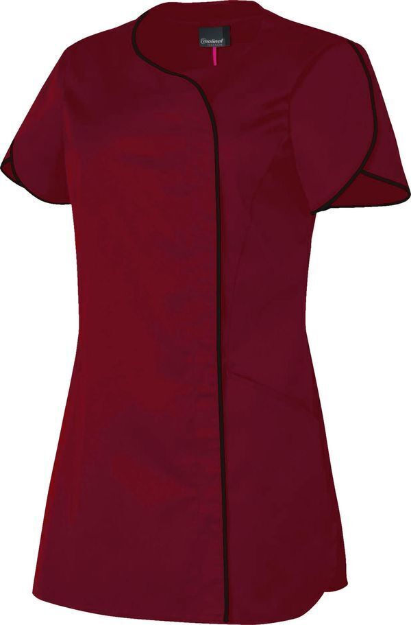 Tunique encolure V. Fermeture asymétrique bordée d’un passepoil contrasté. Fermeture, fermée par grippers cachés. Découpes princesse devant et dos. Poches basses dans découpes devant. Manches courtes formes tulipe bordées d’un passepoil contrasté. Bas arrondi. Fentes côtés. Longueur : 75 cm.
