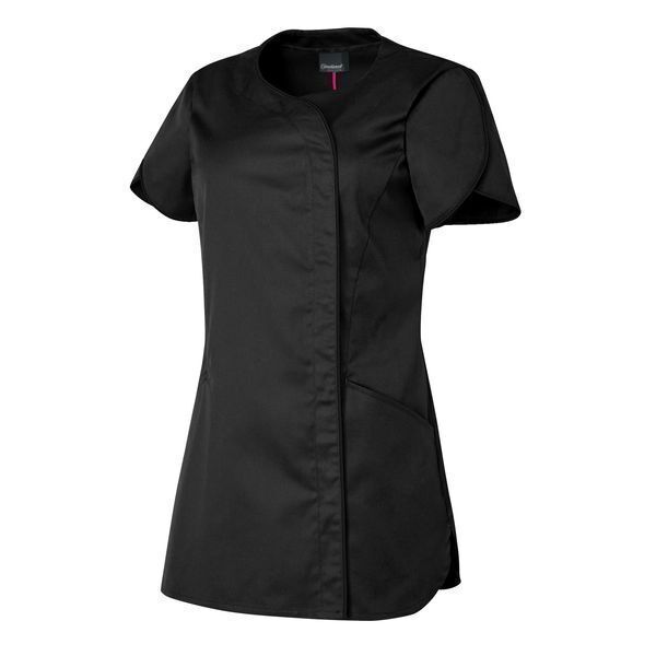 Tunique encolure V. Fermeture asymétrique bordée d’un passepoil contrasté. Fermeture, fermée par grippers cachés. Découpes princesse devant et dos. Poches basses dans découpes devant. Manches courtes formes tulipe bordées d’un passepoil contrasté. Bas arrondi. Fentes côtés. Longueur : 75 cm.