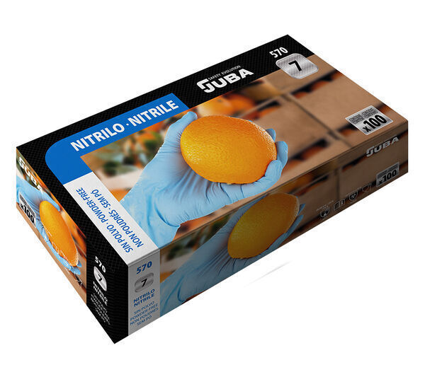 Gants nitrile bleu non poudrés. Longueur : 24 cm. Épaisseur : 0,12 mm.