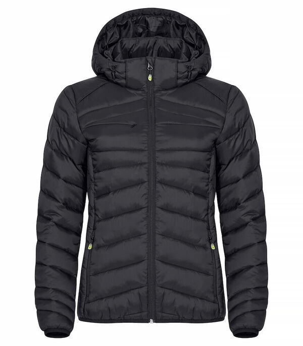 Doudoune femme avec manches. Col montant. Fermeture à glissière. Capuche amovible. Poche poitrine avec fermeture à glissière. 2 poches basses avec fermeture à glissière. 2 poches intérieures. Bande élastique taille et poignets. Passe écouteurs.