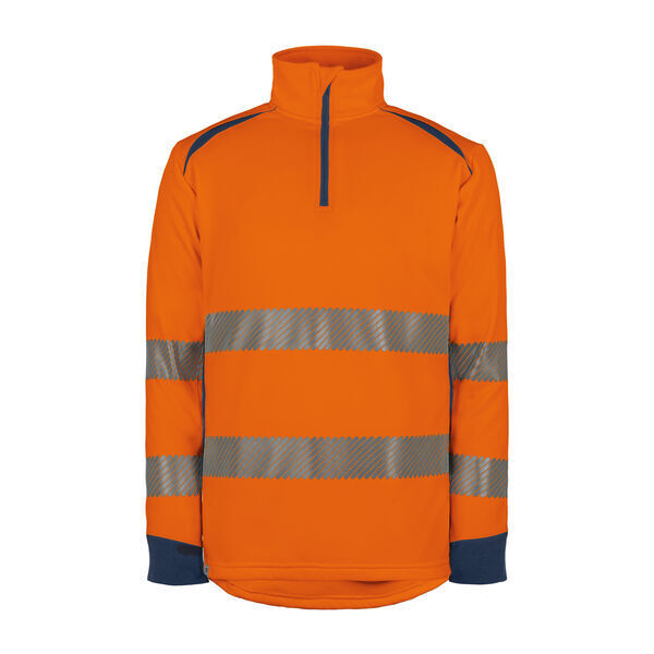 Sweat-shirt certifié GRS. Col camionneur avec protège menton au niveau du zip. Manches longues, poignets en maille Cordura®. Renforts Cordura® coudes, poignets, épaules. Dos protège-reins. | Coupe ajustée. Bandes rétroréfléchissantes microbilles RETHIOTEX® segmentées thermocollées.