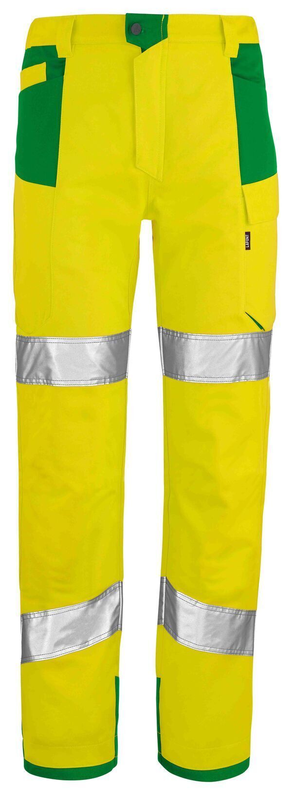 Pantalon haute visibilité. Ceinture élastiquée côtés avec 5 passants. Fermeture à glissière et bouton clou apparent. 2 poches cavalières contrastées. Poche ticket côté droit. Poche cuisses à soufflet sous rabat fermé par bouton caché. Poche mètre à soufflet. Poche dos plaquée. | Bandes rétroréfléchissantes segmentées 70 mm. E.J. : 80 cm (+5 cm). Existe en Ripstop été : 1HVNL